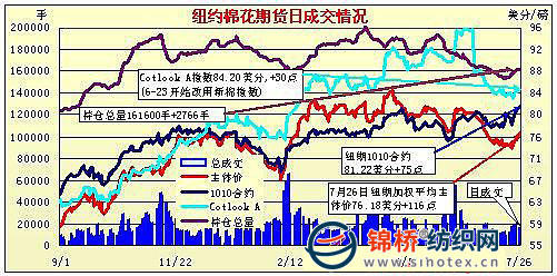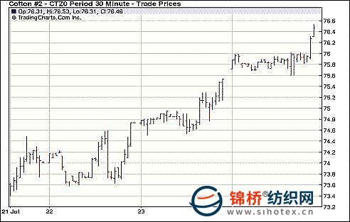 7月26日,美國(guó)股市繼續(xù)上揚(yáng),美元指數(shù)再度回落,大宗谷物走勢(shì)大多數(shù)較弱,不過紐約期棉延續(xù)強(qiáng)勢(shì),再度攀高,主力12月合約收漲百點(diǎn)有余。當(dāng)日紐約期棉小幅高開,早盤橫盤震蕩,其它谷物品種走弱,午盤后,期棉合約得以快速拉升,主力12月合約觸及76.53美分/磅,盤終維持高位收盤,分析人士認(rèn)為期棉登記庫(kù)存觸及低位,12月期棉合約在73美分得到較強(qiáng)支撐,并有效突破75美分的波動(dòng)上限,后市上揚(yáng)動(dòng)力較強(qiáng),因此貿(mào)易買盤兼投機(jī)買盤入市推高棉價(jià)。 紐約棉花期貨主力1012合約近三個(gè)交易日交易走勢(shì) |