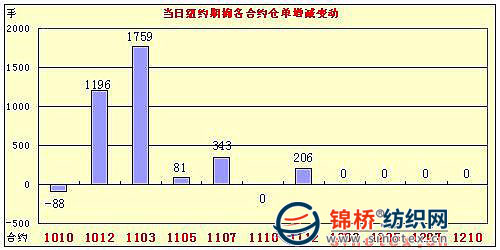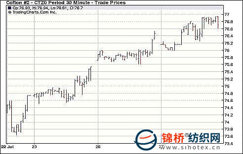 7月27日,美國7月份消費者信心指數(shù)下滑,憂慮情緒再升,美元指數(shù)走漲,大宗商品漲跌不一,期棉近期和主力合約受助于緊張的庫存數(shù)據(jù),盤終小幅上漲,其它合約均回落。當日紐約期棉小幅高開,早盤回落,美元走強令期棉承壓,不過近期和主力合約在庫存棉花數(shù)量降至低位的背景下拉高,不僅10月和12月合約構成倒掛,同時由于市場預期新年度12月新花不能充分緩解庫存緊張局勢,因此12月和3月合約亦構成倒掛形勢,而遠期合約則由于市場預計美棉豐收均呈現(xiàn)回落走勢。 紐約棉花期貨主力1012合約近三個交易日交易走勢 |