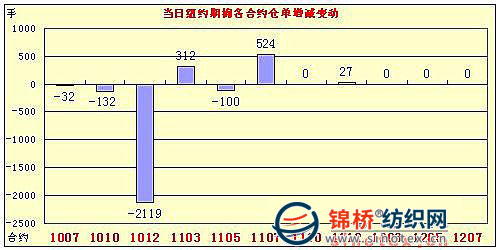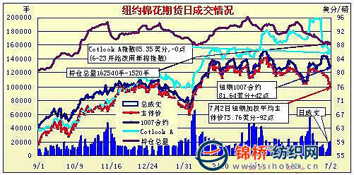 7月2日,美國就業(yè)數(shù)據(jù)報告利空,美元指數(shù)、原油期貨,美國股市繼續(xù)回落,受此影響,紐約期棉震蕩走低,終盤除了近期合約收漲外,其它合約中幅下跌。當日紐約期棉早盤窄幅震蕩,但午盤后在外圍利空的影響下,投機賣盤再度施壓,期棉再度大幅下跌,不過尚在前日的波動區(qū)間之內(nèi),紐約期棉周一休市,長周末因素也促使尾盤交投活躍,部分資金撤離,但低位貿(mào)易買盤活躍,對期棉形成較強支撐。 紐約棉花期貨主力1012合約近三個交易日交易走勢 |
