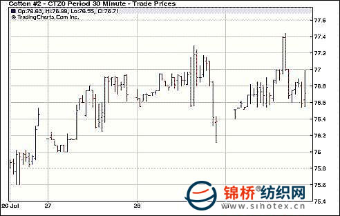 7月29日,美國(guó)經(jīng)濟(jì)前景不佳拖累美元指數(shù)走弱,外圍大宗商品紛紛走強(qiáng),登記庫(kù)存續(xù)降刺激商業(yè)買(mǎi)盤(pán)入場(chǎng)推動(dòng)期棉收高。當(dāng)日紐約期棉平開(kāi),早盤(pán)小幅上揚(yáng),維持震蕩,美元指數(shù)走弱刺激外圍大宗商品普遍強(qiáng)勢(shì)走高;登記庫(kù)存繼續(xù)下降,偏緊張的庫(kù)存刺激商業(yè)買(mǎi)盤(pán)入場(chǎng);雙重因素推動(dòng)12月合約沖至77.44美分/磅,隨后有所回落,但尾盤(pán)保持中幅上揚(yáng),盤(pán)終均上漲。 紐約棉花期貨主力1012合約近三個(gè)交易日交易走勢(shì) |