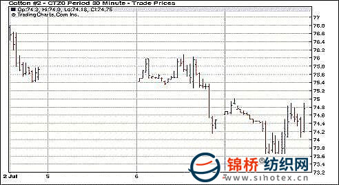 7月7日紐約期棉全面上揚,近期合約漲幅過百,其它合約小幅收漲,成交量仍保持在1萬余手。當日期棉早盤震蕩,午盤后受到打壓,觸發(fā)止損賣盤,12月合約最低至73.55美分/磅;后低位買盤涌入,期棉大幅反彈,并一度沖擊關(guān)鍵阻力位75.00美分/磅,最終收回跌幅。7月合約收于82.71美分/磅,漲111點;12月合約收于74.56美分/磅,漲24點。 紐約棉花期貨主力1012合約近三個交易日交易走勢 |