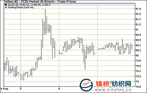 8月9日,紐約期棉多漲少跌,近期10月合約收于84.17美分/磅,下跌23點(diǎn),主力12月合約80.39美分/磅,漲16點(diǎn),其他合約以19-52點(diǎn)不同幅度收漲。市場(chǎng)當(dāng)日交易相對(duì)平穩(wěn),12月合約波動(dòng)空間僅有64點(diǎn)--低點(diǎn)79.99美分/磅,高點(diǎn)80.63美分/磅。中國(guó)拋儲(chǔ)消息的明確,引起廣泛關(guān)注,同時(shí),在USDA報(bào)告即將發(fā)布前,交易商持觀望心態(tài)。當(dāng)12月合約跌至低點(diǎn),市場(chǎng)有買(mǎi)盤(pán)支持,登記庫(kù)存進(jìn)一步減少,市場(chǎng)獲得更多支撐,最終以整體小漲收盤(pán)。中國(guó)將于10日起投放60萬(wàn)噸儲(chǔ)備棉,禁止倒買(mǎi)倒賣(mài)的投機(jī)行為,從當(dāng)前看,對(duì)ICE期棉并無(wú)太大影響,但要關(guān)注投放儲(chǔ)備棉后全球棉花的期末庫(kù)存變化情況。巴基斯坦持續(xù)降雨,引起人們對(duì)產(chǎn)量的擔(dān)憂。USDA即將發(fā)布的供需報(bào)告中,巴基斯坦棉花產(chǎn)量有下調(diào)的可能。 紐約棉花期貨主力1012合約近三個(gè)交易日交易走勢(shì) |