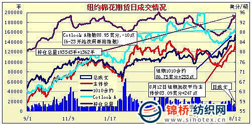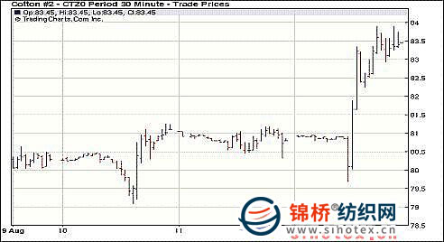 市場(chǎng)觀望多日的USDA(美國(guó)農(nóng)業(yè)部)供需預(yù)測(cè)報(bào)告出臺(tái),結(jié)果出人意料,紐約期棉大幅上漲,近期10月合約收于86.75美分/磅,漲253點(diǎn),主力12月合約83.55美分,漲265點(diǎn)。美農(nóng)業(yè)部8月份全球棉花產(chǎn)銷預(yù)測(cè)報(bào)告中,在調(diào)增10/11年度棉花產(chǎn)量和消費(fèi)量的同時(shí),也大幅調(diào)低09/10年度期末庫(kù)存量,導(dǎo)致10/11年度期末庫(kù)存大幅下降至千萬(wàn)噸以下。數(shù)據(jù)顯示,09/10年度,全球棉花期末庫(kù)存1035.9萬(wàn)噸,較7月份下調(diào)74.2萬(wàn)噸。其中中國(guó)419.8萬(wàn)噸,調(diào)減26.3萬(wàn)噸、印度減25.1萬(wàn)噸、巴基斯坦減13.4萬(wàn)噸、美國(guó)增加4.4萬(wàn)噸。10/11年度,全球棉花產(chǎn)量預(yù)計(jì)2544.1萬(wàn)噸,調(diào)增18.1萬(wàn)噸。其中印度增21.8萬(wàn)噸、美國(guó)增5.1萬(wàn)噸、巴基斯坦減15.3萬(wàn)噸。全球消費(fèi)2631.6萬(wàn)噸,調(diào)增25.4萬(wàn)噸。其中中國(guó)1088.6萬(wàn)噸,調(diào)增21.7萬(wàn)噸。10/11年度全球期末庫(kù)存993萬(wàn)噸,調(diào)減93.7萬(wàn)噸,較上年度減少42.9萬(wàn)噸。其中中國(guó)364.8萬(wàn)噸,調(diào)減40.5萬(wàn)噸,比上年度減少55萬(wàn)噸。 紐約棉花期貨主力1012合約近三個(gè)交易日交易走勢(shì) |