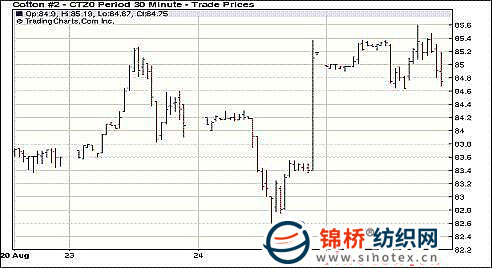 8月25日紐約期棉先揚(yáng)后抑,弱勢收盤,近期10月合約收于88.15美分/磅,跌27點(diǎn),主力12月合約84.86美分/磅,跌36點(diǎn)。印度和巴基斯坦相關(guān)的消息對市場形成壓力。當(dāng)日市場弱勢開盤,盤中有買盤支持反彈,12月合約最高上漲至85.60美分,超過前一個交易日的最高點(diǎn)。印度出現(xiàn)利好降雨,產(chǎn)量前景更為樂觀,巴基斯坦因洪災(zāi)產(chǎn)量看減,但有消息稱巴基斯坦將通過增加印度棉進(jìn)口量來補(bǔ)充用棉需求,另外,外部商品市場、股市和原油期貨盤中大跌,期棉受壓下滑,12月合約跌破85美分。雖然交易尾段外部商品市場全面反彈,期棉仍以弱勢收盤。 紐約棉花期貨主力1012合約近三個交易日交易走勢 |