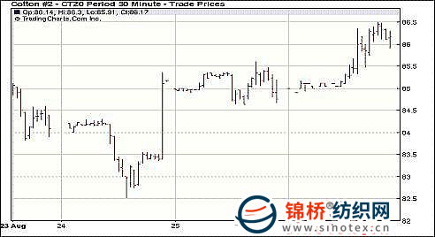 8月26日紐約期棉市場全面反彈,多數(shù)合約漲幅過百點,近期10月合約89.24美分,漲109點,主力12月合約86.15美分/磅,漲129點。當(dāng)日市場上半場交易平淡交易,但后半場交易中受外部商品市場反彈、美棉出口周報利好以及美國主產(chǎn)棉區(qū)德州氣溫過低,刺激買盤涌入,12月合約在突破前幾日高點85.67美分后沖上關(guān)鍵阻力位86美分,并收于該水平之上。據(jù)美國統(tǒng)計局?jǐn)?shù)據(jù),2009/10年度美棉的期末庫存64.2萬噸,低于美國農(nóng)業(yè)部(USDA)之前預(yù)測的67.5萬噸,這也預(yù)示著下一次預(yù)測結(jié)果中USDA會進(jìn)一步調(diào)低美棉期末庫存量。8.13-8.17一周美國凈簽約出口10/11年度陸地棉107184噸,較前周增6%;裝運54749噸,較前周增1%;凈簽約出口本年度皮馬棉3084噸,較前周減6%;裝運227噸,較前周減26%;此外凈簽約出口11/12年度陸地棉408噸。 紐約棉花期貨主力1012合約近三個交易日交易走勢 |