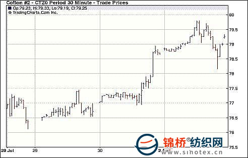 8月2日為國(guó)際棉花2010/11年度紐約期棉的首個(gè)交易日,多數(shù)合約收漲,其中近期10月合約收于83.85美分/磅,漲149點(diǎn),主力12月合約收于79.34美分/磅,漲58點(diǎn)。美國(guó)股市收于10個(gè)月以來(lái)最高水平,美元匯率大幅走軟,商品期貨市場(chǎng)整體收漲,刺激了投機(jī)商對(duì)棉花期貨市場(chǎng)加大了買(mǎi)盤(pán)力度。受助于投機(jī)買(mǎi)盤(pán)和技術(shù)性買(mǎi)盤(pán)支持,12月合約穩(wěn)定開(kāi)盤(pán)后盤(pán)中大幅走高,最高點(diǎn)達(dá)到79.80美分/磅,沖刺80美分失敗后回吐部分漲幅,結(jié)算價(jià)停留在79.34美分。 紐約棉花期貨主力1012合約近三個(gè)交易日交易走勢(shì) |