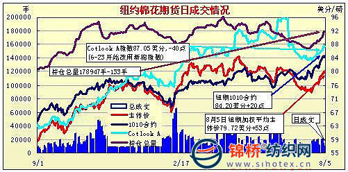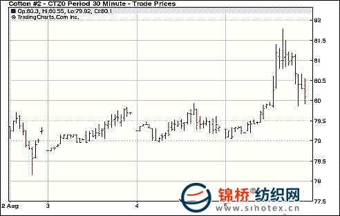 8月5日紐約期棉市場緊張遠跌。近期10月合約收于84.20美分/磅,漲20點,主力12月合約盤中大漲,最終結(jié)算價80.06美分/磅,漲59點,達到該合約成立以來的最高結(jié)算價。當(dāng)日市場上半場交易平穩(wěn),12月合約在80美分以下“試探性”走高。受技術(shù)性因素推動,12月合約突破80美分,投機買單等支持性買盤一觸即發(fā),推動期棉繼續(xù)走強,芝加哥期貨交易所(CBOT)小麥近期9月合約漲停,以及期棉登記庫存進一步減少,都給期棉帶來支持,12月合約最高上漲到81.78美分/磅。在82美分城下市場缺乏足夠買盤,無力進一步形成突破,獲利了結(jié)賣盤進場,市場從高點回落,最終以前五份合約小漲后面合約下跌結(jié)束交易。 紐約棉花期貨主力1012合約近三個交易日交易走勢 |