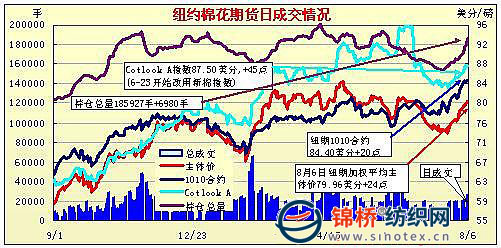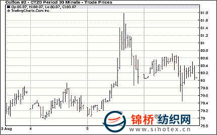 8月6日市場以普遍上漲收盤,近期10月合約收于84.40美分/磅,漲20點,主力12月合約收于80.23美分/磅,漲17點。巴基斯坦和美國棉區(qū)的天氣狀況引起廣泛關(guān)注。當(dāng)日市場早盤呈現(xiàn)弱勢,12月合約跌破80美分,最低下行至79.45美分。外部市場小麥期貨有所下跌,給市場帶來壓力。但受助于期棉市場登記庫存量繼續(xù)減少,巴基斯坦棉區(qū)持續(xù)降雨,損失暫無法估計,美國南部棉區(qū)持續(xù)高溫,都對期棉形成支持。最終,12月合約穩(wěn)定收于80美分/磅。分析師指出,12月合約停留在80美分以上十分關(guān)鍵,雖然巴基斯坦和美國部分棉區(qū)天氣狀況不佳并無礙全球增產(chǎn)的大趨勢,但也能給處于關(guān)鍵位置的期棉帶來“一絲暖意”。 紐約棉花期貨主力1012合約近三個交易日交易走勢 |