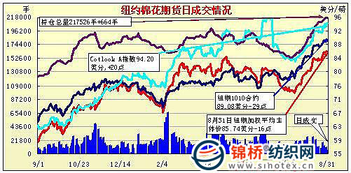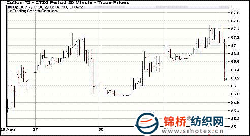 8月31日紐約期棉主力合約沖高回落,盤終小幅收跌。當(dāng)日市場開盤平穩(wěn),早盤窄幅震蕩,午盤后在買盤支持下震蕩走高,主力12月合約最高至87.71美分/磅,為近兩年來高點(diǎn)。最后45分鐘,棉市在獲利回吐賣盤打壓下迅速回落,主力合約最低至86.13美分/磅。盤終各合約呈現(xiàn)近跌遠(yuǎn)漲,10月合約收于89.08美分/磅,跌29點(diǎn);12月合約收于86.20美分/磅,跌23點(diǎn);遠(yuǎn)期合約小幅收漲。 紐約棉花期貨主力1012合約近三個(gè)交易日交易走勢 |