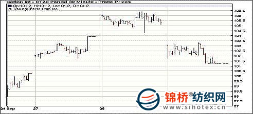 9月29日印度棉出口政策公布,中國期棉盤中跌停,紐約期棉遭遇強(qiáng)大賣壓,大多數(shù)合約收于跌停價位,12月合約收于101.24美分/磅。當(dāng)日期棉小幅高開后急速下滑,印度棉出口政策公布,另外中國棉花期貨大跌,均為ICE期棉帶來外圍壓力,期棉承壓回落,低位震蕩,盤中觸及跌停,之后少量投機(jī)買盤介入,促使期棉從跌停位拉起,但賣盤壓力導(dǎo)致ICE期棉再度跌停,并保持至盤終。由于周三跌停,周四ICE期棉漲跌停板再度擴(kuò)板至500點(diǎn)。 紐約棉花期貨主力1012合約近三個交易日交易走勢 |