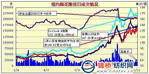 1月11日紐約期棉市場再度上漲,近期三份合約漲停,1112月合約盤中站上其歷史最高位,近期3月合約結算價147.25美1分/磅,1112月合約104.92美分/磅,漲240點。當日市場穩(wěn)定開盤后走強,受貿易商買盤和外部市場整體走強,期棉穩(wěn)步走高,交易后期受市場預期12日晚USDA(美國農業(yè)部)報告結果利好的影響,盤尾3月合約高位震蕩后止于漲停,1112月合約最高觸及105.2美分。 紐約棉花期貨近期1103合約近三個交易日交易走勢 |