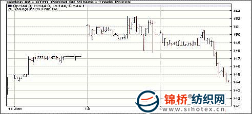 1月13日紐約期棉大幅下跌,近期3月合約收于144.06美分/磅,跌391點,1112月合約102.38美分/磅,跌205點。市場成交量維持高位。當日市場高開低走,早盤因美棉出口報告利好穩(wěn)定在149美分的水平,但交易后期因印度棉相關出口消息打壓及技術(shù)賣盤壓力急速下跌,近期3月合約出現(xiàn)跌停,最終收于近低點。據(jù)印度當?shù)孛襟w消息,印度相關部門將在1月14日召開棉花會議,研究是否增加棉花出口限額的事宜。 紐約棉花期貨近期1103合約近三個交易日交易走勢 紐約棉評:獲利了結(jié) 期棉收跌