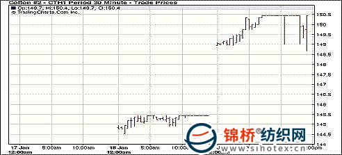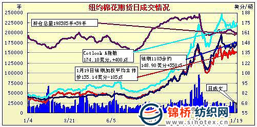 1月19日紐約期棉市場近期合約全線上漲,近期3月合約148.94美分/磅,漲350點,1112月合約104.48美分/磅,漲119點。成交量相比前一日回升。當日市場高開高走,交易中期市場重心上移,近期3月合約向150美分逐步靠攏,后3月合約漲幅達到500點的漲停位,1112月合約盤中最高達到107.79美分,刷新該合約歷史紀錄。后因獲利了結(jié)賣盤打壓,3月合約漲停板兩度被打開,最終收于漲停板之下。交易商稱,美元下跌是部分原因刺激在棉花市場有投資者和投機買盤。外部市場美元指數(shù)下跌,原油和谷物期貨上漲,給市場帶來上漲動力。另外,有交易商在炒作中國代表團在美國簽訂了棉花采購合同的概念。 紐約棉花期貨近期1103合約近三個交易日交易走勢 紐約棉評:投機買盤 期棉收高