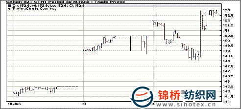1月20日外部商品市場(chǎng)雖普遍下跌,但紐約期棉先抑后揚(yáng),近期合約152.94美分/磅,封于漲停板,1112月合約105.70美分/磅,漲122點(diǎn)。受美元上漲商品市場(chǎng)普跌以及預(yù)期中國(guó)將進(jìn)一步調(diào)控以抑制通貨膨脹的影響,紐約期棉市場(chǎng)高開低走。外部市場(chǎng)雖未反彈,但期棉市場(chǎng)在貿(mào)易買盤和期權(quán)相關(guān)基金買盤推動(dòng),跌勢(shì)迅速扭轉(zhuǎn),近期合約升向漲停。 紐約棉花期貨近期1103合約近三個(gè)交易日交易走勢(shì) 紐約棉評(píng):供應(yīng)憂慮持續(xù) 期棉收盤漲停