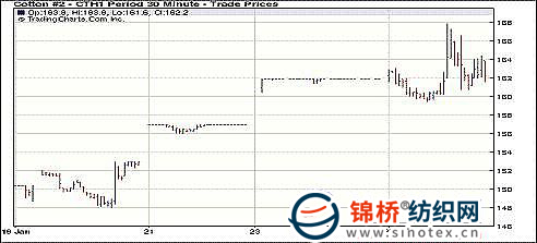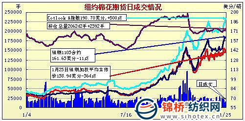 1月25日紐約期棉上漲勢頭被打破,近期3月合約收于161.83美分/磅,跌11點,1112月合約108.67美分/磅,跌507點。市場成交量明顯擴大。當(dāng)日3月合約早盤在158-163美分/磅之間寬幅震蕩,盤中在在159美分處尋找支撐,近日交易后半段,3月合約再度飆漲,最高較前一日上漲了595點,而后期市場因之前幾個交易日飆漲,“惹來”獲利了結(jié)盤打壓,另外,外部商品市場大豆和玉米期貨下滑,給期棉也帶來一定壓力,期棉從高位下滑,并以普遍下跌收盤。但據(jù)分析,目前現(xiàn)貨市場需求旺盛,近期合約抗跌性相比遠期合約要強。 紐約棉花期貨近期1103合約近三個交易日交易走勢 紐約棉評:三月份合約投機買盤 期棉收低