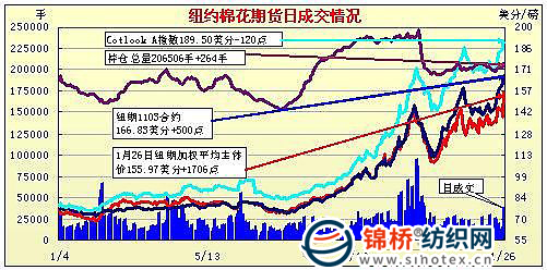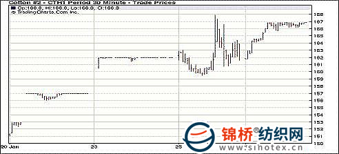 1月26日紐約期棉近期合約收于166.83美分/磅,封于漲停,1112月合約110.43美分/磅,漲176點。外部商品整體上漲,推動期棉繼續(xù)走高。當(dāng)日市場早盤處于穩(wěn)定狀態(tài),盤中震蕩走高。奧巴馬的國情咨文以及美聯(lián)儲聲明令投資者感到振奮,美國股市及整個商品市場整體走高,期棉亦獲上漲動能,近期3月合約最終走向漲停。 紐約棉花期貨近期1103合約近三個交易日交易走勢 |