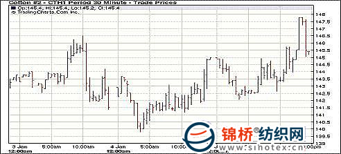 1月5日紐約期棉盤中波動(dòng)劇烈,以全面上漲收盤,近期3月合約145.20美分/磅,漲142點(diǎn),2011年12月合約100.02美分/磅,漲51點(diǎn)。5日美國(guó)相關(guān)機(jī)構(gòu)公布的勞動(dòng)力市場(chǎng)與服務(wù)業(yè)數(shù)據(jù)均好于預(yù)期,商品市場(chǎng)忽略美元走強(qiáng)的因素全面上漲,期棉早盤沖高,3月合約突破多個(gè)止損買單,一度占上漲停位置。交易后期市場(chǎng)遇獲利了結(jié)賣盤打壓回吐部分漲幅,最終3月合約漲百余點(diǎn)。