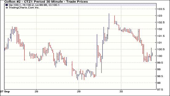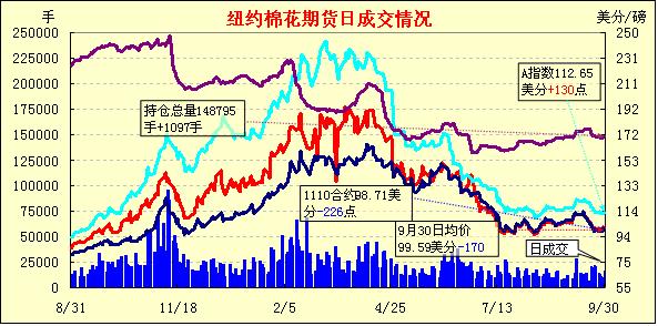 9月30日美元走強(qiáng)施壓于整個(gè)商品市場(chǎng),紐約期棉隨外圍市場(chǎng)下滑,盤終全面收跌。當(dāng)日棉市早盤走高,主力12月合約最高點(diǎn)達(dá)103美分/磅。后美元走強(qiáng),整個(gè)商品市場(chǎng)承壓下挫,期棉受外圍拖拽下滑,加之月末及季末的倉(cāng)位調(diào)整,棉市早到賣盤打壓,盤終大幅收跌。近期1110月合約收于98.71美分/磅,跌226點(diǎn);12月合約收于100.19美分/磅,跌203點(diǎn)。