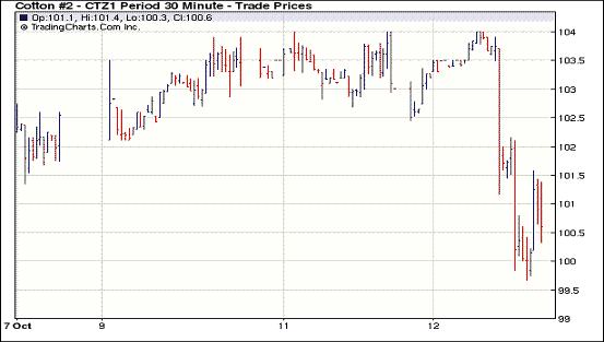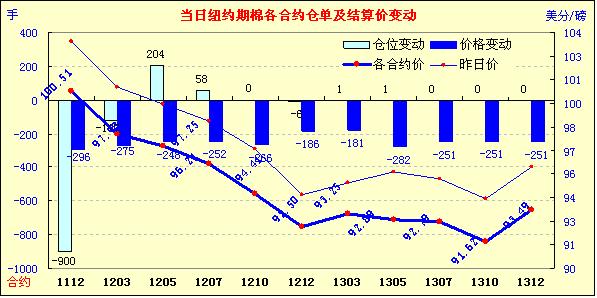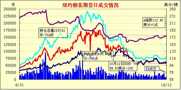 在美國農(nóng)業(yè)部(USDA)最新預(yù)測全球產(chǎn)量調(diào)增、消費調(diào)減及美棉出口調(diào)減等利空因素打壓下,10月12日紐約期棉全面大幅收跌,主力1112月合約結(jié)算價100.51美分/磅,跌296點,1203月合約結(jié)算價97.98美分/磅,跌275點;其他遠(yuǎn)期合約跌幅在181-252點不等。當(dāng)日市場早盤震蕩走高,主力1112月合約至當(dāng)日最高104.00美分/磅(+53點);后受美國農(nóng)業(yè)部(USDA)全球產(chǎn)消預(yù)測報告利空因素打壓,期棉主力回落至1美元之下,至當(dāng)日最低點99.67美分/磅,達(dá)10月4日(99.25美分/磅)以來的最低點,震蕩幅度達(dá)433點;尾盤時在買盤支撐下回補(bǔ)部分跌幅,盤終主力合約大幅收跌。美國農(nóng)業(yè)部報告偏空,預(yù)計2011/12年度全球棉花產(chǎn)量2704萬噸,較上月調(diào)增27萬噸;全球消費2490萬噸,調(diào)減18萬噸;期末庫存1194萬噸,調(diào)增64噸。因進(jìn)口國需求減少,本年度美棉出口調(diào)減11萬噸至250萬噸。分析師指出,雖然歐債危機(jī)出現(xiàn)轉(zhuǎn)機(jī),但受過去幾周經(jīng)濟(jì)前景的不確定性及歐債危機(jī)影響,棉花需求仍舊不穩(wěn)定。