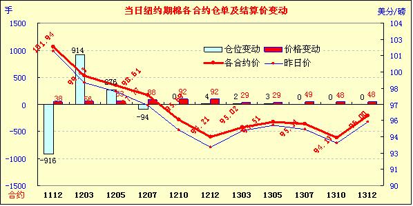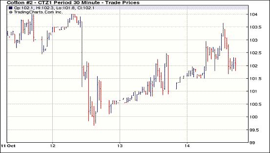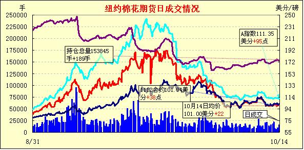 10月14日美元指數(shù)走弱,給商品市場帶來利好,紐約期棉沖高回落,多數(shù)合約中幅收漲。當日市場開盤后震蕩走高,美國經(jīng)濟數(shù)據(jù)利好、歐洲樂觀情緒及美元盤中走弱導致買盤涌入商品市場,紐約期棉12月合約盤中最高達103.65美分/磅,超過前一日高點102.25美分/磅。后高點賣盤打壓,導致價格回落,12月合約收于101.94美分/磅,漲38點;3月合約收于99.43美分/磅,漲56點;其它合約收漲29-92點不等。