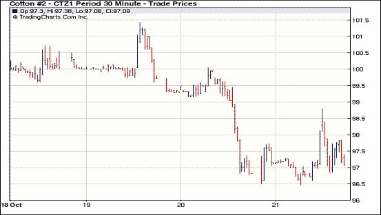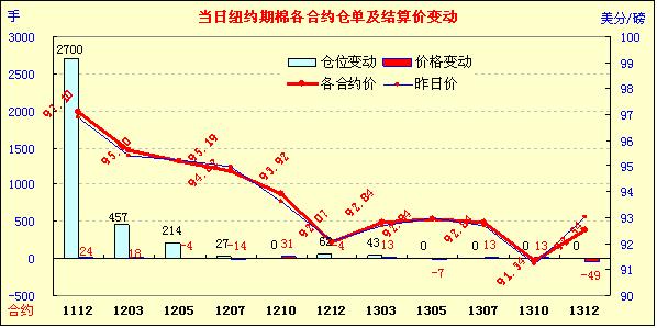 歐元區(qū)財長也批準向希臘發(fā)放下一批貸款,受周末歐元區(qū)峰會的樂觀預(yù)期提振,美國股市周五飆升。道瓊斯工業(yè)股票平均價格指數(shù)漲267.01 點,至11808.79點,漲幅2.31%;本周累計上漲1.4%。標準普爾500指數(shù)漲22.86點﹐至1238.25點,漲幅1.88%。那斯達克綜合指數(shù)漲38.84點,至2637.46點,漲幅1.49%。受外圍市場因素影響,紐約期棉在買盤支撐下止跌微穩(wěn)。各合約綜合指數(shù)96.64美分,微漲57點。1112月合約收于97.1美分,漲24點;1203合約收于95.6美分,漲18點。倉單量繼續(xù)增加,當日增倉3503手,總持倉增至15.62萬手。其中1112合約增倉2700手,1203合約增倉457手。由于全球性的棉花豐收,同時因經(jīng)濟面消費需求下降,國際棉花市場弱勢格局仍將維持。