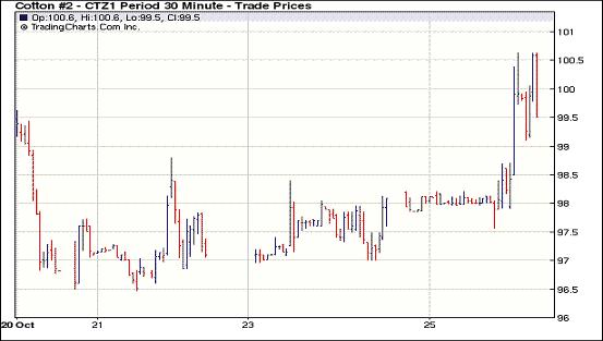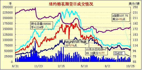 10月25日,紐約期棉連續(xù)第三個(gè)交易日收漲,主力1112月合約結(jié)算價(jià)99.68美分/磅,漲174點(diǎn),盤(pán)中該合約一度站上1美元,1203月合約結(jié)算價(jià)98.31美分/磅,漲193點(diǎn);其他遠(yuǎn)期合約也以大漲收盤(pán)。當(dāng)日市場(chǎng)早盤(pán)窄幅震蕩;午盤(pán)空頭平倉(cāng)促市場(chǎng)強(qiáng)勢(shì)上揚(yáng),主力1112月合最高達(dá)到100.63美分/磅(+269點(diǎn));外圍市場(chǎng)原油和黃金期貨收漲,大豆和小麥期貨漲跌不一,期棉尾段小幅盤(pán)整,最終以全面上漲收盤(pán)。技術(shù)面上,12月合約下一關(guān)鍵技術(shù)阻力位為104美分/磅。