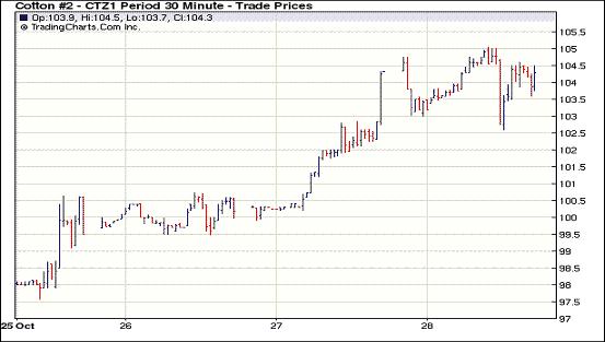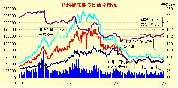 10月28日紐約期棉早盤走高,近期合約觸及6周高點后受到賣盤打壓回落,盤終多數(shù)合約小幅收漲。當日市場開盤后延續(xù)前一日漲勢,早盤走高,近期12月合約最高達到9月20日(105.41美分/磅)以來的最高點105.50美分/磅。后有賣盤進入市場打壓,棉價回落,當日最低點為102.59美分/磅。盤終多數(shù)合約小幅收漲,12月合約收于104.37美分/磅,漲5點;3月合約收于102.50美分/磅,漲19點。近來中國市場積極采購美棉,對棉花價格帶來支撐。只要需求前景樂觀,特別是來自中國的需求能夠保持穩(wěn)定的話,棉花市場有望進一步走強。