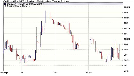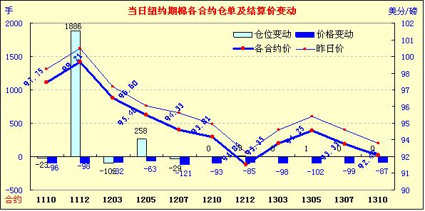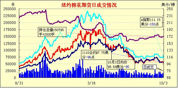 歐洲在應(yīng)對主權(quán)債務(wù)危機問題上面臨困境,引發(fā)了市場對該國或許無法獲得救助資金以避免債務(wù)違約的擔憂,美國股市下挫,原油期貨大跌,美元繼續(xù)走強。受外圍市場影響,10月3日,紐約期棉先抑后揚,收于陰線。主力12月合約早盤一路下滑,由100.65美分下滑240點至98.25美分,之后在買盤支撐下回升,陰收于99.21美分。主力合約繼續(xù)增倉1886手,