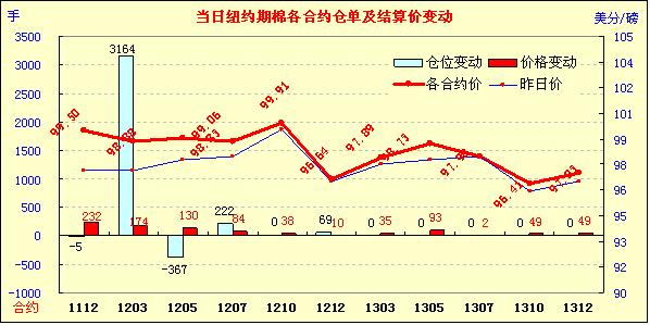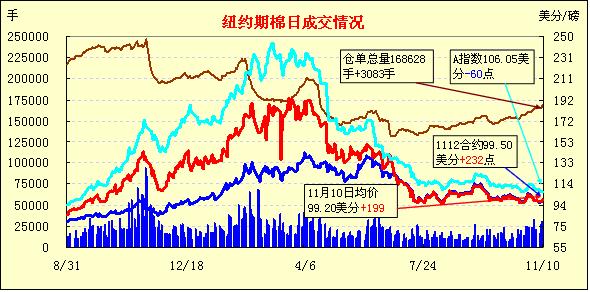 11月10日受美棉出口利好及經(jīng)濟(jì)層面歐債危機(jī)解決出現(xiàn)進(jìn)展、美國就業(yè)市場(chǎng)改善等因素刺激,紐約期棉全面收漲,主力1112月合約結(jié)算價(jià)99.50美分/磅,漲232點(diǎn),1203月合約結(jié)算價(jià)98.88美分/磅,漲174點(diǎn)。市場(chǎng)開盤窄幅震蕩,1112月合約最低點(diǎn)至96.81美分/磅;后美棉出口周報(bào)數(shù)據(jù)利好及市場(chǎng)對(duì)經(jīng)濟(jì)層面預(yù)期樂觀支撐期棉持續(xù)上漲,該合約自11月2日以來首次突破1美元,最高至100.78美分/磅,震蕩幅度397點(diǎn);尾盤時(shí)買盤獲利了結(jié)回吐部分漲幅,盤終該合約收漲200余點(diǎn)。外部商品市場(chǎng)漲跌不一,谷物及油料走低,原油市場(chǎng)走高。10.27-11.3一周美國凈簽約出口本年度陸地棉226343噸,裝運(yùn)24313噸(較前一周增19%,較近四周平均值增31%);其中中國凈簽約本年度陸地棉225912噸,裝運(yùn)11090噸,這對(duì)期棉上漲形成支撐。此外,美國上周首次申請(qǐng)失業(yè)救濟(jì)人數(shù)降至七個(gè)月來最低水平,表明疲軟的美國就業(yè)市場(chǎng)出現(xiàn)好轉(zhuǎn);歐債危機(jī)方面意大利國債收益率回落,希臘周四任命原歐洲央行(European Central Bank)副行長(zhǎng)帕帕季莫斯(Lucas Papademos)為新總理,從而為該國獲得下一批救助鋪平道路,市場(chǎng)認(rèn)為歐債危機(jī)解決進(jìn)程出現(xiàn)好轉(zhuǎn),這也是推動(dòng)期棉上漲的主要原因。