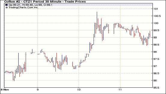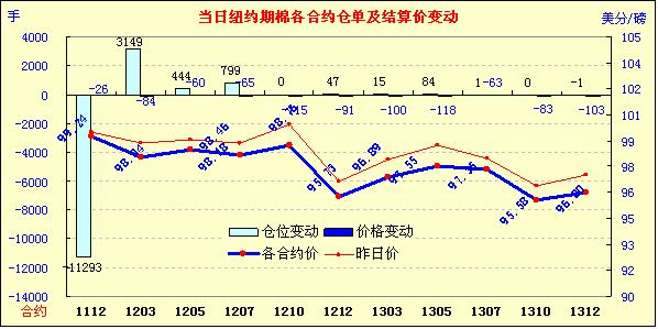 11日11日,紐約期棉全面下跌,近期12月合約結(jié)算價(jià)99.24美分/磅,跌26點(diǎn),1203月合約跌98.04美分,跌84點(diǎn)。前一日市場(chǎng)大漲,當(dāng)日市場(chǎng)遭遇獲利了結(jié)賣(mài)盤(pán)打壓;總成交量有所增加。受獲利了結(jié)盤(pán)打壓及缺乏買(mǎi)盤(pán)跟進(jìn),市場(chǎng)低開(kāi)低走,近期12月合約盤(pán)中99.5美分上下波動(dòng),后在98.5美分處獲支持;主力3月合約最低跌至97.12美分(-176點(diǎn)),尾盤(pán)反彈至98美分一線,市場(chǎng)整體以下跌收盤(pán)。受美棉出口周報(bào)利好影響前一日期棉大漲,中國(guó)是否正式啟動(dòng)對(duì)美棉采購(gòu)需進(jìn)一步關(guān)注;歐債危機(jī)未過(guò)去,期棉突破一美元水平有難度。