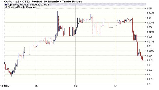11月17日市場圍繞歐洲主權(quán)債務(wù)危機(jī)的擔(dān)憂加劇,歐美股市及外部商品市場全線下挫,紐約期棉同樣受累大幅收跌,前兩份合約跌停,近期1112月合約結(jié)算價(jià)99.50美分/磅,主力1203月合約結(jié)算價(jià)96.48美分/磅。