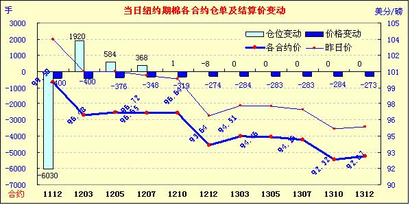 當(dāng)日市場平穩(wěn)開盤,后美棉出口周報(bào)利好支持期棉上漲,近期1112月合約當(dāng)日最高至103.96美分/磅,主力1203合約最高至100.85美分/磅;午盤后受經(jīng)濟(jì)層面利空及外部商品市場大跌拖累,期棉大幅回落,盤終1112月及主力合約跌停,其他遠(yuǎn)期合約也均大幅收跌。