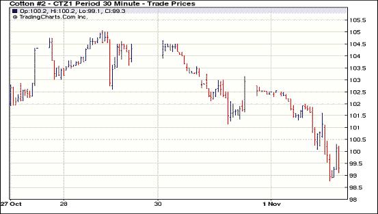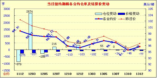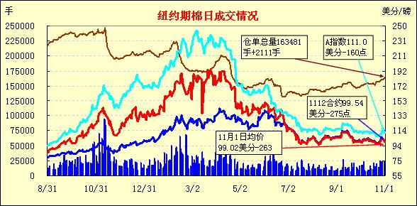 因美元走強(qiáng)及市場(chǎng)對(duì)經(jīng)濟(jì)層面的擔(dān)憂導(dǎo)致美國(guó)股市及外部大豆、原油市場(chǎng)走低,11月1日紐約期棉受拖累再度全面下跌,主力1112月合約結(jié)算價(jià)99.54美分/磅,跌275點(diǎn),1203月合約結(jié)算價(jià)98.55美分/磅,跌227點(diǎn);其他遠(yuǎn)期合約跌幅34-185點(diǎn)不等。當(dāng)日市場(chǎng)高開(kāi)低走,主力1112月合約受歐洲債務(wù)危機(jī)憂慮影響,跌破9日以來(lái)的移動(dòng)平均線100.38美分/磅,當(dāng)日最低至98.77美分/磅(-352點(diǎn));尾盤時(shí)買盤介入,但市場(chǎng)反彈幅度有限,盤終該合約大幅告跌。外部市場(chǎng)漲跌不一,大豆及原油走低,小麥及玉米走高。希臘舉行全民公投的計(jì)劃引發(fā)了市場(chǎng)對(duì)歐元區(qū)救助方案可能落空的擔(dān)憂,導(dǎo)致美國(guó)股市昨日連續(xù)第二個(gè)交易日走低,歐洲股市遭遇拋售,期棉與其他市場(chǎng)共同承壓,近期能否再次上揚(yáng)還需關(guān)注經(jīng)濟(jì)層面的進(jìn)一步發(fā)展。