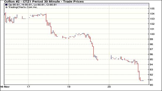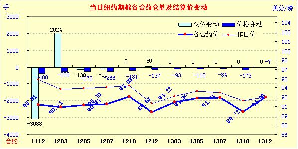 11月21日受歐美債務(wù)問題的擔(dān)憂拖累,美元走高,紐約期棉跟隨歐美股市及外部商品市場(chǎng)全線走低的態(tài)勢(shì)大幅收跌,近期1112月合約結(jié)算價(jià)90.81美分/磅,跌400點(diǎn),主力1203月合約結(jié)算價(jià)90.41美分/磅,跌286點(diǎn)。當(dāng)日市場(chǎng)小幅高開,主力1203月合約當(dāng)日最高至93.44美分/磅(+17點(diǎn));后市場(chǎng)對(duì)歐美經(jīng)濟(jì)的擔(dān)憂導(dǎo)致賣盤涌入,期棉承壓走低;尾盤時(shí)外部商品市場(chǎng)大幅走低拖累期棉跌幅加深,盤終主力合約收于2010年12月22日以來最低點(diǎn),其他合約也均大幅收跌。市場(chǎng)擔(dān)心意大利和西班牙借貸成本居高不下或推升歐元區(qū)信貸緊縮風(fēng)險(xiǎn),美國(guó)國(guó)會(huì)特別委員會(huì)無法在最后期限前達(dá)成預(yù)算赤字削減協(xié)議也令市場(chǎng)承壓,期棉和其他廣泛交易的大宗商品同步走低。