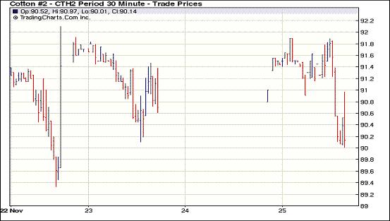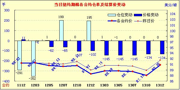 11月25日雖然美棉出口周報利好,但期棉市場整體走弱。經(jīng)歷感恩節(jié)假日休市一天后,市場觀望氣氛仍重,成交低迷。當日主力合約3月合約跳空高開,上半場交易多在91-91.5美分間窄幅波動;盤中時間美棉出口周報發(fā)布,美棉前一周出口量高達17萬噸以上,對市場形成一定支持,3月合約短暫突破91.5美分。交易后期因缺乏買盤跟進,經(jīng)濟層面壓力未散,外部商品市場整體走弱,期棉未能獨善其身,整以3月合約以陰跌收盤。中國大手筆進口美棉成為美棉出口最大買家。據(jù)美國農(nóng)業(yè)部(USDA),在11.11-11.17一周美國凈簽約出口本年度陸地棉176130 噸,較上一周增加21%。連續(xù)三周來,美棉出口簽約總量54.75萬噸,其中中國進口54萬噸,占98.6%。歐洲消息仍然主宰著美股市場。據(jù)法新社報道,標普宣布將比利時的主權(quán)信用評級下調(diào)1格,從AA+降至AA。意大利國債收益率升至歐元時代新高,令市場承壓。