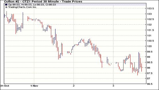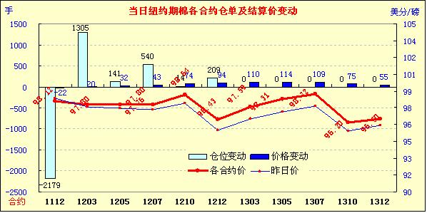 11月3日美元指數(shù)走弱及歐洲債務危機解決方案邁出重要步伐,外圍市場整體走強,紐約期棉近跌遠漲,主力1112月合約結(jié)算價98.12美分/磅,跌22點,1203月合約結(jié)算價97.80美分/磅,漲20點;其他遠期合約均告漲收盤,漲幅32-114點不等。當日市場開盤震蕩走低,后受美元走低及歐元區(qū)消息提振走高,主力1112月合約當日最高至99.44美分/磅(+110點),午盤后受商業(yè)賣盤打壓下跌,最低至97.30美分/磅,震蕩幅度214點;尾盤時買盤介入回補部分跌幅,盤終主力合約微幅收跌,其他各合約以不同幅度收高。因希臘已經(jīng)放棄針對救助方案的全民公投計劃,而且歐洲央行意外宣布下調(diào)利率,市場對這一轉(zhuǎn)變表示歡迎,預示著歐盟已朝著一個全面解決方案邁出了一些重要步伐。歐美股市及商品市場受利好消息刺激普遍走高,原油期貨昨日創(chuàng)下兩個月來最高水平,期棉同樣受助上漲,漲勢能否持續(xù)需關(guān)注歐債危機解決進程的進一步發(fā)展。
