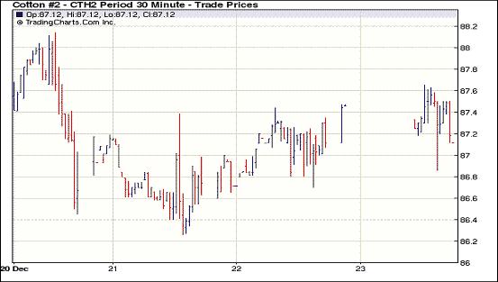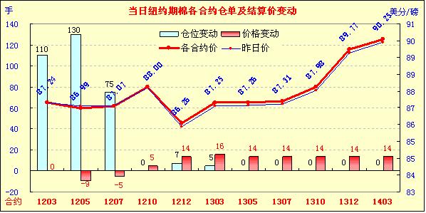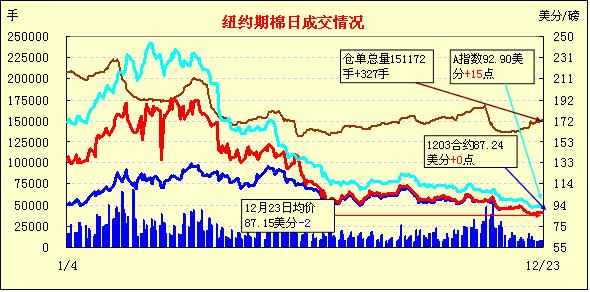 12月23日,受圣誕節(jié)假期影響,紐約期棉橫盤弱勢震蕩,主力1203月合約結(jié)算價87.24美分/磅,不變,1205月合約結(jié)算價86.99美分/磅,跌9點,其他合約普遍微幅收漲。投資者普遍進入休假期,市場成交極為清淡。市場開盤震蕩走低,主力1203月合約最低至86.86美分/磅;后因美國股市走高及外圍商品市場提振,該合約上行至當日最高點87.65美分/磅,震蕩幅度79點;尾盤時買盤獲利了結(jié)回吐部分漲幅,盤中該合約與前一日持平。當日外圍谷物及油料市場普遍持穩(wěn)并微幅收漲。因棉花基本面消費疲軟,且投資者在節(jié)前結(jié)清頭寸休假,市場成交持續(xù)平淡,預計棉價元旦前難以擺脫弱勢,將延續(xù)低位橫盤格局 。外圍市場方面,道瓊斯工業(yè)股票平均價格指數(shù)漲至五個月高點,投資者因美國經(jīng)濟增長加速以及國會在薪資稅減稅問題上打破僵局而受到鼓舞,美國股市周五收盤連續(xù)第四個交易日上揚。因12月26日(下周一)是圣誕節(jié)假期,紐約期棉休市一天。