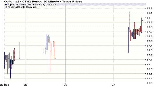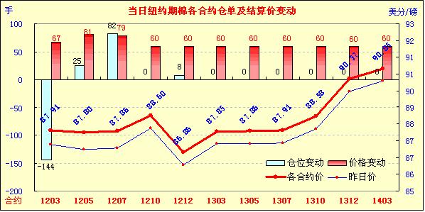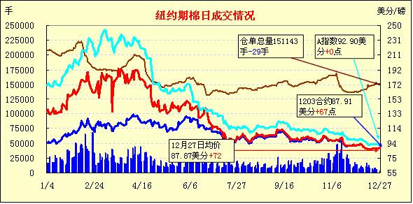 12月27日,在外部商品市場(chǎng)大幅走高及少量買盤支持下,紐約期棉普遍中幅上漲,主力1203月合約結(jié)算87.91美分/磅,漲67點(diǎn),1205月合約結(jié)算價(jià)87.80美分/磅,漲81點(diǎn)。由于多數(shù)投資者離場(chǎng)休假,市場(chǎng)成交極為清淡。當(dāng)日主力1203月合約早盤沖高至88.12美分/磅(+88點(diǎn)),后買盤獲利了結(jié),該合約回落至當(dāng)日最低點(diǎn)87.24美分/磅;尾盤時(shí)買盤再次介入促市場(chǎng)反彈,盤終該合約中幅告漲。當(dāng)日外部谷物及油料市場(chǎng)普遍大幅上漲。