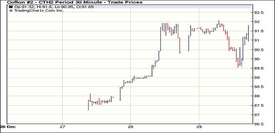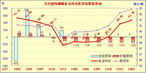 12月29日,美國經(jīng)濟數(shù)據(jù)略有改善推動美股走高,意大利國債拍賣平平引發(fā)市場擔憂重燃,紐約期棉前三份合約收漲,主力1203月合約結(jié)算價91.63美分/磅,漲95點,1205月合約結(jié)算價91.36美分/磅,漲79點,遠期合約普遍中幅或大幅收跌。當日市場開盤后窄幅震蕩,美國經(jīng)濟數(shù)據(jù)利好促使買盤涌入,主力1203月合約受支撐上行至92.09美分/磅(+141點);后歐洲消息不佳打壓市場回落,該合約跌至89.53美分/磅,震蕩幅度256點;尾盤時回補部分跌幅,盤終該合約大幅告漲。當日外部市場漲跌不一,大豆、玉米及小麥期貨走低,原油期貨上揚。29日市場消息多空交織,最新公布的數(shù)據(jù)顯示,美國截至12月24日當周首次申請失業(yè)救濟人數(shù)連續(xù)第四周保持在400,000人的關口下方,11月份成屋簽約銷量升至19個月來的最高水平,這給市場帶來提振;意大利年內(nèi)最后一次國債拍賣的結(jié)果令投資者失望,歐元兌美元跌至2010年9月份以來的最低水平,導致圍繞歐元區(qū)債務問題正在惡化的擔憂再度重燃。