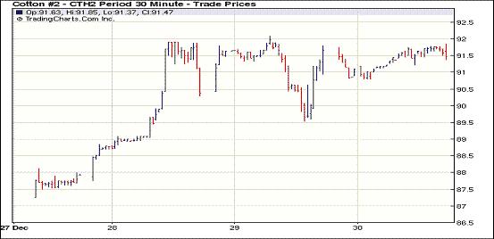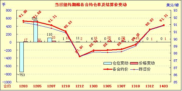 12月30日是2011年的最后一個(gè)交易日,由于缺乏消息面影響,紐約期棉在少量買盤支撐下弱勢(shì)告漲,主力1203月合約結(jié)算價(jià)91.80美分/磅,漲17點(diǎn),1205月合約結(jié)算價(jià)91.68美分/磅,漲32點(diǎn)。投資者不愿在新年長(zhǎng)周末假期前建立頭寸,市場(chǎng)成交清淡。當(dāng)日期棉開盤后震蕩走高,主力1203月合約最高至91.85美分/磅;尾盤時(shí)買盤獲利了結(jié)回吐部分漲幅,盤終該合約收于近3周以來高點(diǎn)。當(dāng)日外部市場(chǎng)漲跌不一,大豆、玉米及小麥期貨走高,原油期貨走低。據(jù)美國(guó)農(nóng)業(yè)部(USDA),12.16-12.22一周美國(guó)凈簽約出口本年度陸地棉17667噸,裝運(yùn)43613噸(較前一周增6%,較近四周平均值增4%);其中中國(guó)凈簽約本年度陸地棉16216噸,裝運(yùn)20185噸。美棉出口平平,對(duì)市場(chǎng)影響不大。