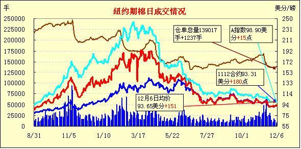 12月6日,因市場預期歐債危機解決可能出現(xiàn)進展,美國股市及外部大宗商品市場受刺激普遍走高,紐約期棉前六份合約大幅收漲,主力1203月合約結算價93.81美分/磅,漲159點。投資者仍普遍持觀望態(tài)度,市場成交持續(xù)清淡。當日期棉低開高走,盤中主力1203月合約挑戰(zhàn)94.00美分/磅未果,當日最高點至93.93美分/磅(+171點);尾盤時買盤獲利了解回吐部分漲幅,盤終該合約連續(xù)第四個交易日收漲,達到11月18日(93.27美分/磅)以來的高點,四日累計漲幅290點。有報道稱,歐洲可能讓歐洲穩(wěn)定機制和歐洲金融穩(wěn)定基金同時運行,此舉將增強歐洲主權債務危機的救助體系,越來越多的人預計歐洲領導人將在本周末舉行的歐盟峰會上宣布大膽措施以應對債務危機,這對金融及商品市場形成支持,至于漲勢能否持續(xù)還需進一步投關注歐元區(qū)領導人峰會。