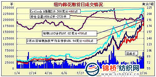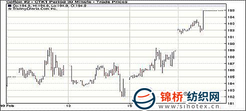 2月16日,紐約期棉延續(xù)周二漲勢,雖然外圍商品繼續(xù)承壓,但期棉大幅高開,本年度合約和10月合約收于漲停價位,其它合約也有較大漲幅。當日期棉大幅高開,雖然外圍谷物和油脂類商品繼續(xù)承壓,但期棉在空頭回補和新一輪的技術買盤拉動下再度大幅走強,經(jīng)過早盤高位盤整后,期棉本年度合約紛紛躍升至漲停價位,并封死漲停至盤終。盤終近期3月合約收于197.02美分/磅,而5月合約收于194.93美分/磅,均逼近200美分/磅。 紐約期棉近期1105合約近三個交易日交易走勢 |