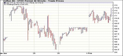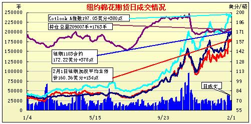 2月1日,美元指數(shù)繼續(xù)趨弱,利好大宗商品,大宗谷物市場大多保持揚升態(tài)勢,紐約期棉再度迫近前期高位,其中近期3月合約漲378點收于172.22美分/磅,再創(chuàng)歷史高點。當日期棉大幅高開,中國鄭州棉花期貨春節(jié)前最后一個交易日突破前高,利好期棉保持升勢,同時據(jù)傳印度原定于2月10日的棉花會議暫定取消,因此估計暫無可能擴大棉花出口配額,而美元大幅走弱,推動大宗商品走強,紐約期棉順勢再度大幅上漲,雖然盤中高位震蕩,但盤終各合約繼續(xù)收高,部分合約已經(jīng)突破前期高位,技術面漲勢延續(xù)。