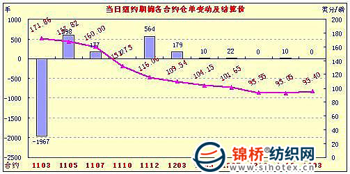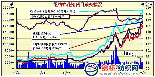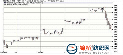 2月3日,隨著歐元區(qū)保持利率不變,歐元大幅回落,美元指數(shù)強勢揚升,外圍商品普跌,兼紐約期棉抑制投機新舉措公布,期棉從漲停到近跌停,巨幅震蕩,盤終放量大跌,近期3月合約逼近跌停,逆轉持續(xù)的升勢。當日期棉繼續(xù)大幅跳空高開,外圍商品有所走弱,但ICE期棉依然大幅上揚,并觸及500點漲停價位(181.22美分/磅),不過美元指數(shù)大幅飆升,外圍商品大幅下跌逐漸對期棉產生壓力,投機賣盤加壓,期棉從高位開始展開自由落體運動,同時ICE公布抑制期棉投機新舉措,亦對期棉起到強勢打壓,雖然下跌過程中,得到部分買盤支撐,但獲利盤力量巨大,最終市場以暴跌收盤。 紐約期棉近期1103合約近三個交易日交易走勢 |