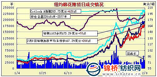 2月8日,在USDA最新全球棉花供需報(bào)告之前,紐約期棉震蕩揚(yáng)升,盤中由于中國再度加息致使期棉急速回落,盤終除3月近期合約小幅收漲,其它合約繼續(xù)大幅上漲。當(dāng)日期棉小幅高開,外圍商品普通走強(qiáng),期棉繼續(xù)沖高,3月合約最高上漲365點(diǎn)到178.16美分/磅,但中國于春節(jié)結(jié)束之際再度加息令市場(chǎng)承壓,期棉快速回落,期棉3月合約下探至172.94美分/磅,但紡企買盤提振期棉,同時(shí)3月期權(quán)馬上到期,展期交投活躍均活躍交易,并令期棉回升。期棉3月和5月價(jià)差從周一的369點(diǎn)大幅縮窄至159點(diǎn)。 紐約期棉近期1103合約近三個(gè)交易日交易走勢(shì) |