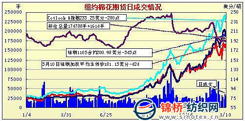 受外部商品市場(chǎng)下跌影響,3月10日紐約期棉市場(chǎng)近期5月合約和1107月合約下跌300余點(diǎn),5月合約結(jié)算價(jià)200.98美分/磅,遠(yuǎn)期12月合約保持漲勢(shì),結(jié)算價(jià)128.80美分/磅,漲220點(diǎn)。當(dāng)日貿(mào)易買盤給予市場(chǎng)支持,5月合約早盤穩(wěn)定走高,最高達(dá)到207.71美分(+172點(diǎn)),盤中震蕩,交易后期美國(guó)經(jīng)濟(jì)數(shù)據(jù)令人失望,中東與北非政局持續(xù)動(dòng)蕩,歐洲主權(quán)債務(wù)危機(jī)再度引起憂慮,迫使美國(guó)股市和商品市場(chǎng)均出現(xiàn)下滑,美元匯率走強(qiáng),期棉難以獨(dú)善其身,尾盤出現(xiàn)下滑,最終收于近低點(diǎn)。遠(yuǎn)期12月合約受美棉出口周報(bào)利好保持漲勢(shì)。USDA(美國(guó)農(nóng)業(yè)部)全球棉花供需預(yù)測(cè)月報(bào)出臺(tái),全球棉花消費(fèi)和期末庫(kù)存數(shù)據(jù)調(diào)整變化不大,期棉市場(chǎng)反應(yīng)平淡;美棉出口周報(bào)顯示上周美國(guó)凈簽約出口下年度陸地棉89380噸,對(duì)遠(yuǎn)期合約形成支持。 紐約期棉近期1105合約近三個(gè)交易日交易走勢(shì) 紐約棉評(píng):盡管供需報(bào)告利多 棉花期貨仍收低
