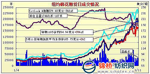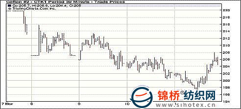 3月11日雖然外部商品市場一片綠色,但紐約期棉市場主力合約翻紅,遠月合約觸底反彈后小幅收跌。主力5月合約結算價204.94美分/磅,漲396點,1112月合約128.32美分/磅,跌48點。當日市場上半場交易平和,5月合約在200-202美分之間波動。盤中,日本地震的消息造成整個谷物期貨和棉花市場下跌,5月合約跌破200美分。后受助于投機買盤和技術性買盤促進市場強勢反彈,5月合約一度攀上207.98美分的漲停位置,交易尾段回吐部分漲幅,最終收漲近四百點;12月合約微幅收跌。 紐約期棉近期1105合約近三個交易日交易走勢 |