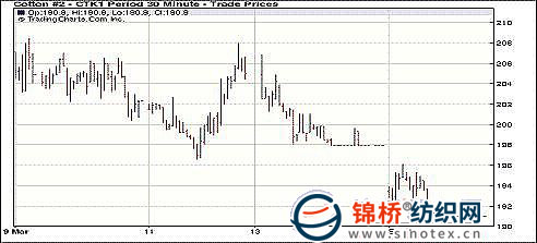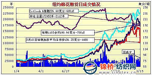 3月15日在恐慌情緒中繼續(xù)下跌,5月合約和7月合約跌停,1112月合約跌至120美分以下,盤終跌幅568點(diǎn);5月合約結(jié)算價(jià)190.94美分/磅,12月合約117.09美分/磅。當(dāng)日早盤5月合約在195-199美分間波動(dòng),盤中震蕩走低,交易后期跌停。日本地震以來核危機(jī)愈演愈烈,市場(chǎng)對(duì)全球經(jīng)濟(jì)造成沖擊的擔(dān)憂越來越重,全球股市和主要商品市場(chǎng)、原油期貨連續(xù)下跌,棉花缺乏投機(jī)資金炒作,繼續(xù)演繹下跌行情,同時(shí),現(xiàn)貨在期貨價(jià)格急速下跌過程中成交清淡,期棉難以抵擋大環(huán)境的下跌壓力。