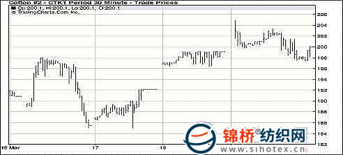 3月21日,紐約期棉市場多漲少跌,日內(nèi)波幅較大,近期5月合約最高價204.88美分/磅,最低價197.35美分,結(jié)算價198.96,跌16點;1112月合約結(jié)算價124.37美分,漲53點。當日市場開盤在炒作基本面短期供應緊張概念走高,5月合約輕松突破200美分,同時開盤的中國電子盤早盤走高也給紐約期棉支持,但市場在高位遭遇技術(shù)性賣盤及獲利了結(jié)盤打壓回落,盤中雖現(xiàn)反攻勢頭,但盤尾5月合約仍跌破200美分,微幅收跌。
