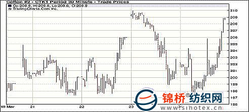 3月24日因美棉出口周報(bào)超出市場意料,紐約期棉獲得支持上漲。近期5月合約結(jié)算價208.82美分/磅,漲695點(diǎn),1112月合約收于127.81美分,漲114點(diǎn)。5月合約開盤穩(wěn)定,早盤在200-204美分之間波動,盤中因缺乏買盤跟進(jìn)破位下跌,5月合約最低跌至196.87美分(-500點(diǎn)),后美棉出口周報(bào)發(fā)布,上周美棉本年度棉花出口量超過7萬噸,超出市場預(yù)期范圍,期棉低點(diǎn)反彈,以接近漲停收盤。